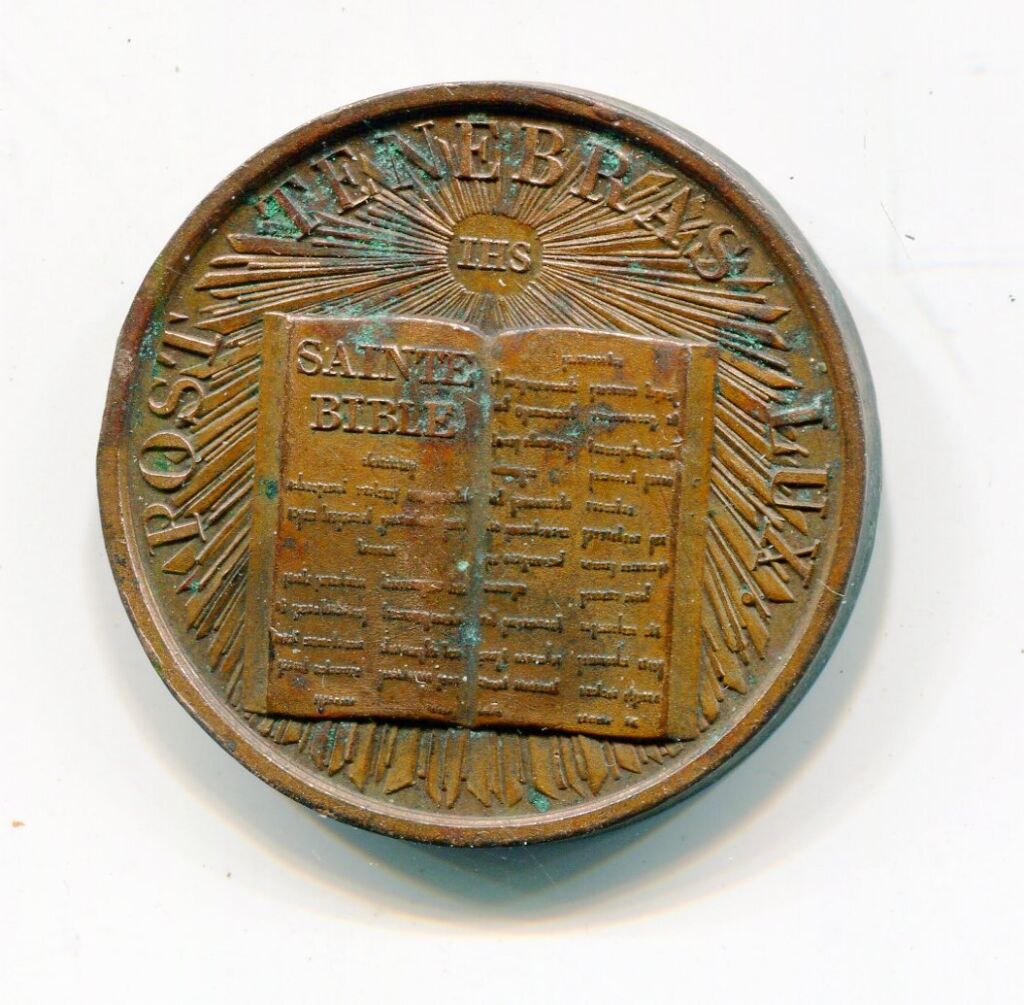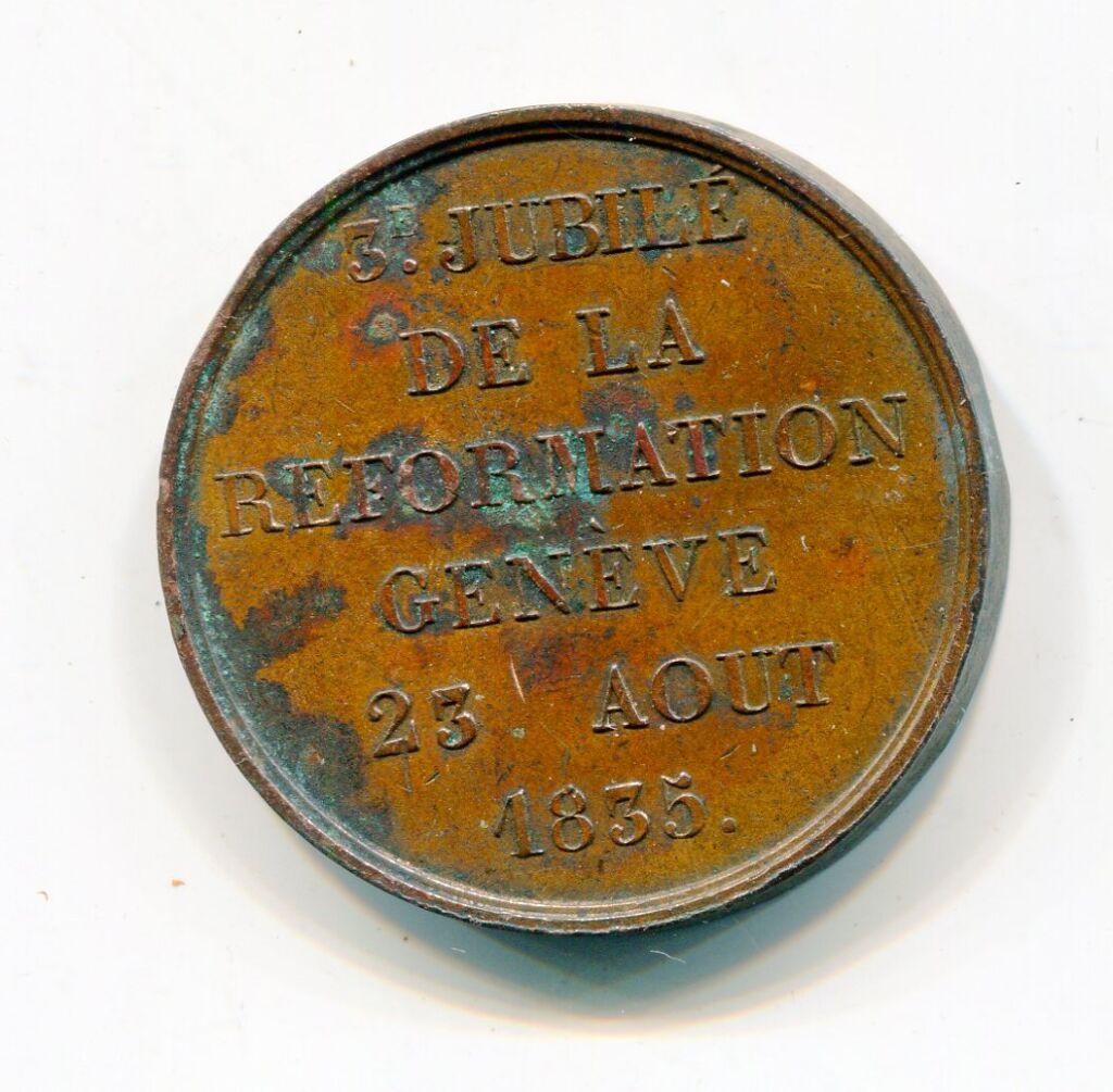 RELIGION PROTESTANTE - " 3e JUBILE de la REFORMATION GENEVE 23 août 1835", médaille commémorative - à l'avers sur fond de rayons partants de " IHS - LA SAINTE BIBLE " ouverte avec légende en pourtour "POST TENEBRAS LUX" (la lumière après l'obscurité - Cuivre 33 mm - 17,94 grammes - TB