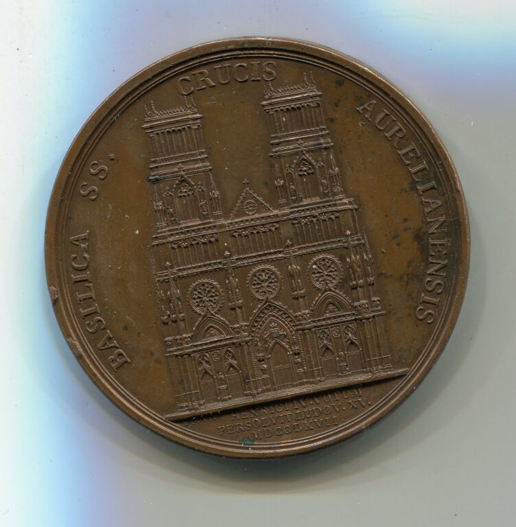 Revers : " BASILICA SS. CRUSSIS AURELIANSIS " la cathédrale Sainte Croix d'Orléans de face - à l'exergue : HENRICI IV. VOTUM / PERSOLVIT LUDOV XV / MDCC LXVII.