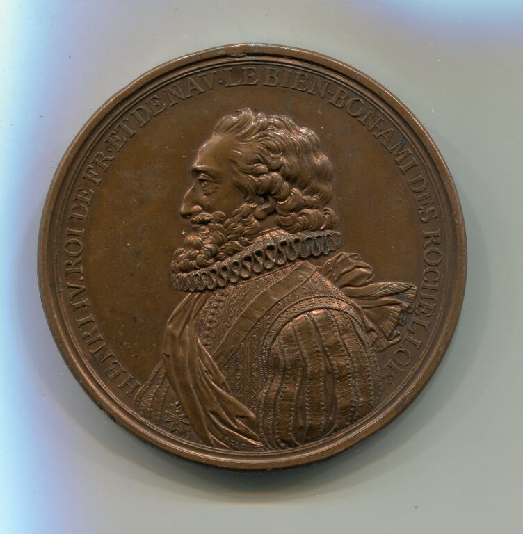 HENRI IV ROI DE FR. ET. DE NAV. LE BIENBON - AMI DES ROCHELLOIS ", buste haut relief du roi en habits de cour avec fraise - OEuvre signée B. DUVIV.
