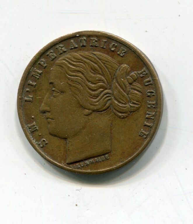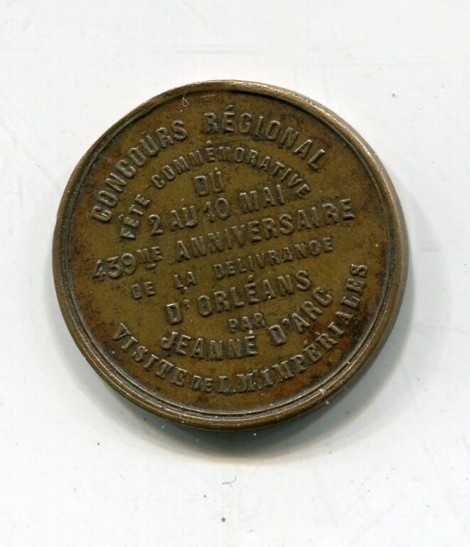 " S.M. L'IMPERATRICE EUGENIE / CONCOURS REGIONAL, fête commémorative du 2 au 10 mai, 439e ANNIVERSAIRE de la DELIVRANCE D'ORLEANS par JEANNE D'ARC, VISITE de S.M. L' IMPERATRICE " - Petite médaille souvenir de l'évènement. Au revers texte, au droit portrait de sa majesté, profil à gauche - œuvre signée Vieuxmaire.