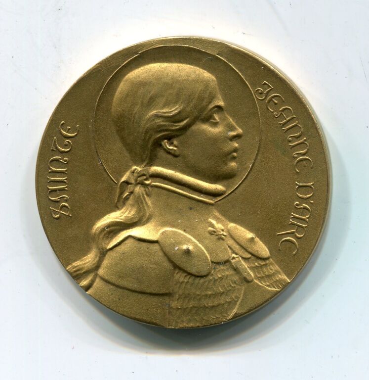 Jeanne d'arc de profil à droite, en cuirasse, longs cheveux et tête nimbée.