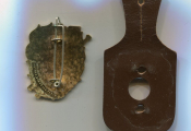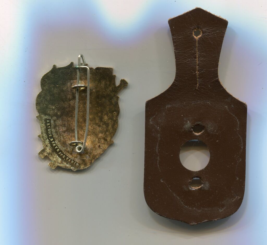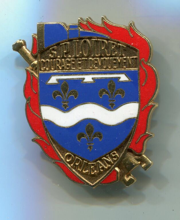 SAPEURS POMPIERS - insigne régimentaire - émail grand feu. Sur fond de flammes en rouge, blason de l'orléanais avec mentions : S.P. LOIRET / COURAGE et DEVOUEMENT : ORLEANS - écu 45 x 36 mm - fabrication Arthus Bertrand , attache avec épingle au dos.
