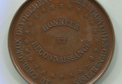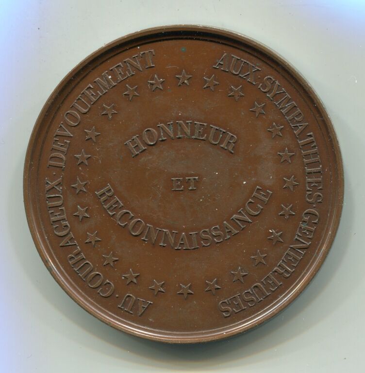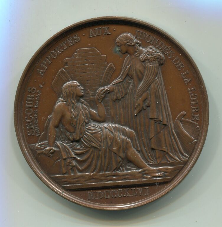 MDCCC XLVI (1846) - Sur fond d'arche de pont, les secours symbolisés par une femme vêtue à l'antique, debout, tenant une coupe pleine de fruits, tenant la main d'une femme sinistrée assise. - Revers : " Honneur et reconnaissance - au courageux dévouement, aux sympathies généreuses " - 141 grammes - L/A n° 1120 - SUP belle patine chocolat.