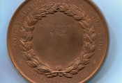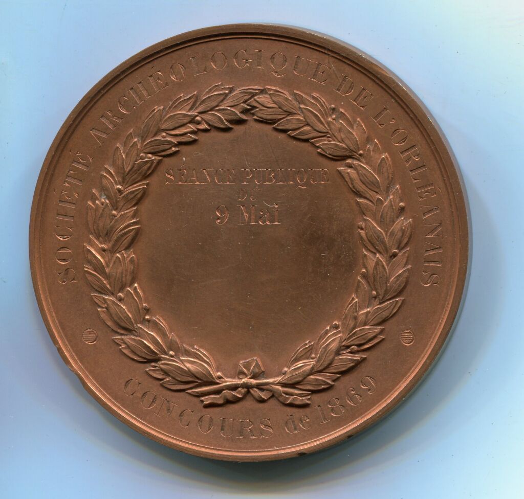 " SOCIETE ARCHEOLOGIQUE de L'ORLEANNAIS, CONCOURS de 1869, SEANCE PUBLIQUE du 9 MAI " - Grande médaille de récompense 68 mm, cuivre rouge.