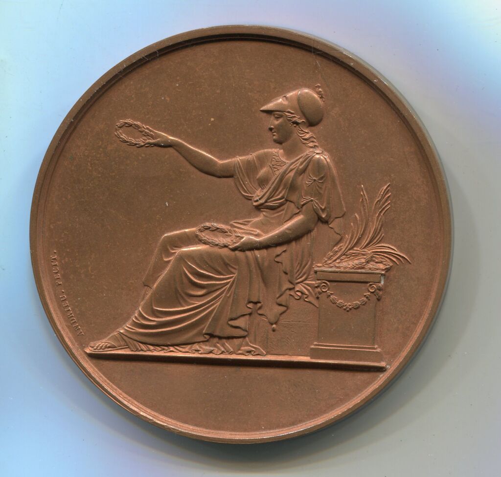 Minerve coiffée du casque corinthien, assise à gauche, bras droit tendu avec une couronne de laurier ; dans la main gauche et sur le socle réserve de couronnes - signé ANDRIEU.