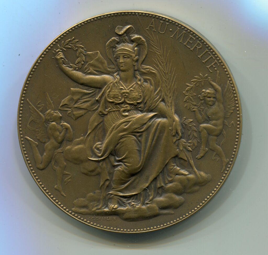 Groupe allégorique sur un nuage. Au 1er plan femme en toge casquée, brandissant une couronne de laurier, flanquée de deux angelots ailés, œuvre signée J.C. CHAPLAIN.