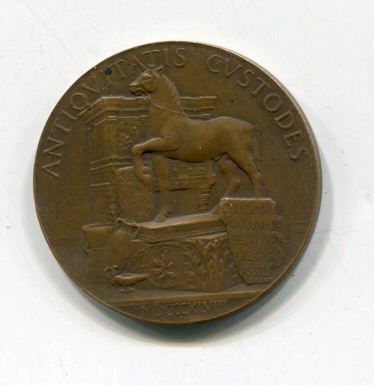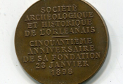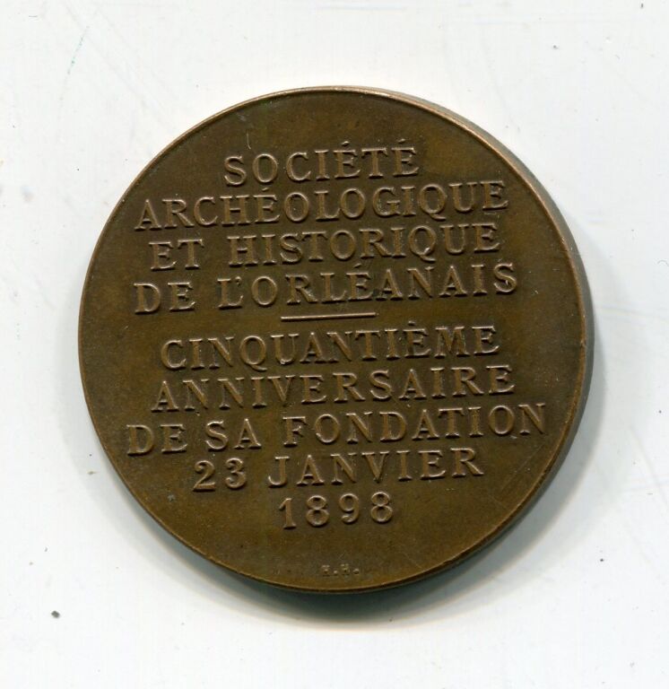 " SOCIETE ARCHEOLOGIQUE et HISTORIQUE de L'ORLEANNAIS " - Jeton cuivre commémoratif du CINQUANTIEME ANNIVERSAIRE de sa FONDATION 23 janvier 1898. "ANTIQVITATIS CVSTODES, cheval debout sur un socle, une jambe levée, placé devant des ruines romaines ; à gauche un socle, amphore, lampe à huile, à l'exergue MDCCCXLVIII. - 31 mm - 10,87 grammes - L/A n° 665 - TTB