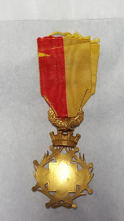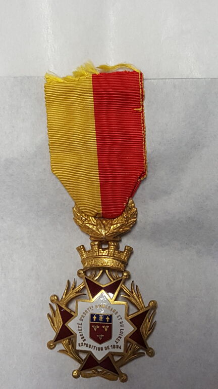 " SOCIETE D' HORTICULTURE D'ORLEANS et du LOIRET / DIPLÔME D' HONNEUR / EXPOSITION de 1894 - médaille pendante taille ordonnance avec ruban partagé jaune & rouge - Email grand feu, Croix bouletée en rouge 48 mm, à 4 branches surmontées d'une couronne et bélière tressée ; en centre croix en émail blanc, blason d'orléans en centre entouré du texte. - L/A n° 2223 - SUP