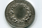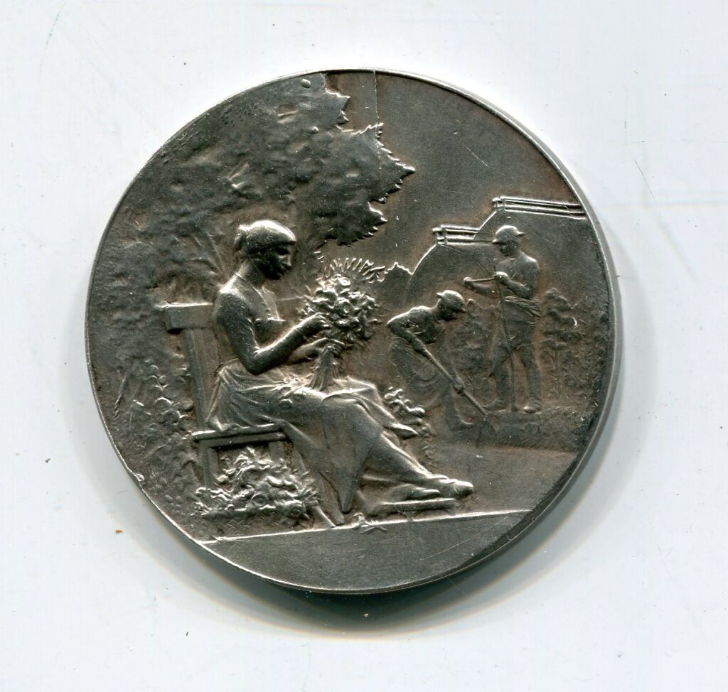 " SOCIETE D'HORTICULTURE ET SOCIETE HORTICOLE REUNIES -ORLEANS ", petite médaille classe argent bronze argenté, couronne de fruits, fleurs et céréales, centre pour attribution.- Avers : femme assise sur un banc faisant un bouquet, à sa droite en 2e plan 2 jardiniers à l'ouvrage devant des serres - 38 mm - 22 grammes - L/A n° 748 - TTB