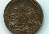 " République Française ", tête laurée coiffée du bonnet phrygien, longs cheveux et palme sur le front ; dessous génie ailé, courant et sonnant de la trompe ; en dessous banderole LIBERTE - OEuvre signée L. BOTTEE - Revers : titre et décor d'une ruche, fleurs & fruits, arrosoirs & outils de jardinage - Attribution en centre : BELOUET BARON 1899.