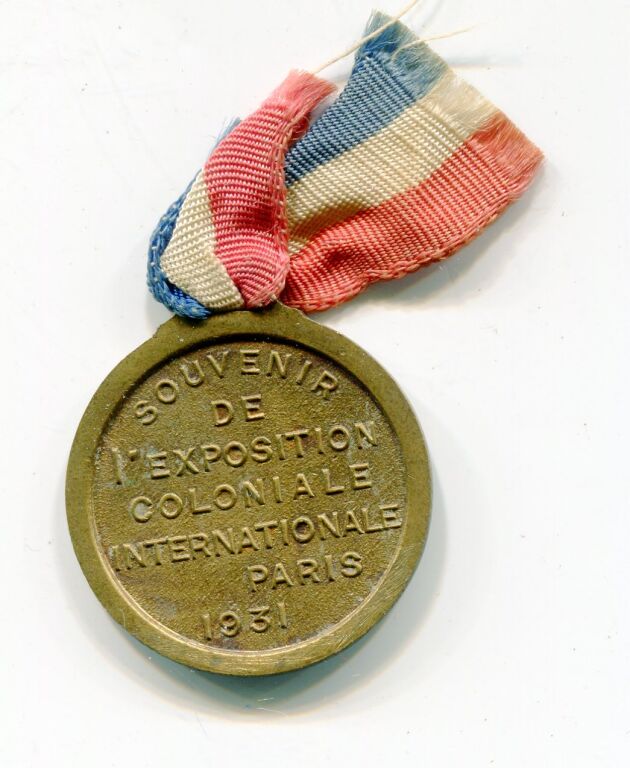 Médaillette de promotion représentation pour moitié de Paris avec sa Tour Eiffel, Arc de Triomphe, Basilique Montmartre, pour l'autre moitié : désert de l'Afrique avec palmiers et dromadaires. Cuivre 25,5 mm avec bélière et son petit ruban tricolore aux couleurs du drapeau national. TTB