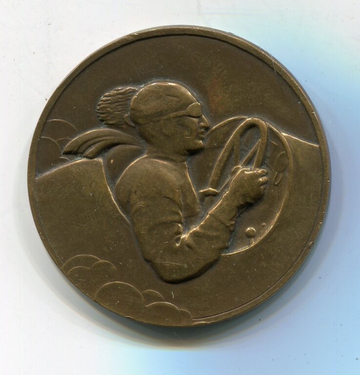 Chauffeur avec son mécanicien au volant de son auto. Très jolie composition du sculpteur THENOT - revers : texte - 50 mm - 52 grammes - L/A n° 1206 a - TTB