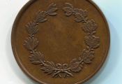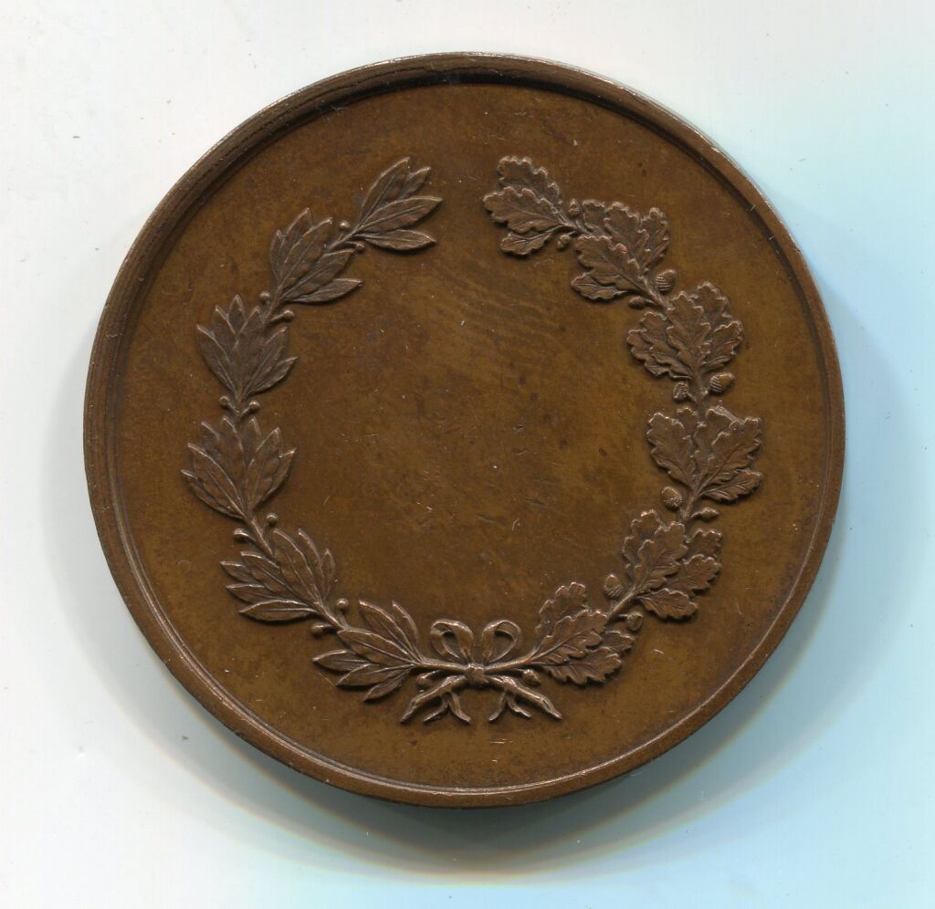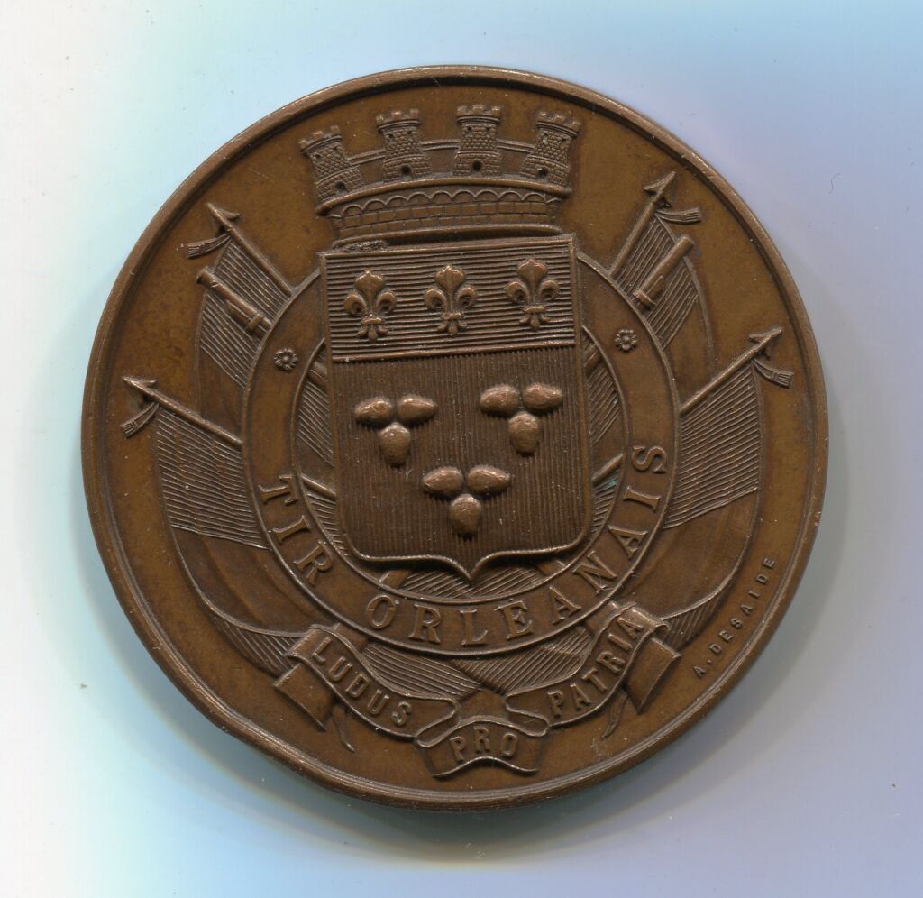 Armes de la ville couronnées posées sur 4 drapeaux inscription "tir orléanais" et "ludus pro patria" - œuvre du sculpteur Desaïde. - Revers : couronne de feuilles de chêne et laurier.