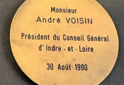 Titre et en centre blason de la Division, pour moitié blason de Tours, pour moitié blason d'Orléans - Attribution spéciale au revers : "Mr André Voisin, Président du Conseil Général d'Indre & Loire 30 août 1990" - 74 mm bronze patiné vieux bronze, fabrication FRAISSE.