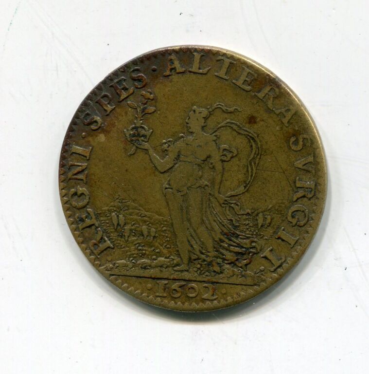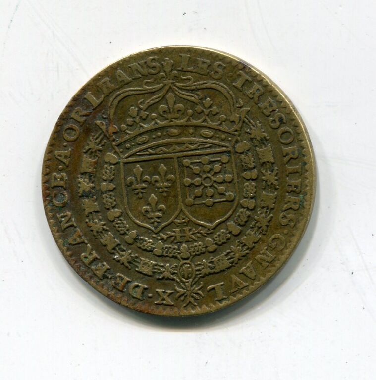 TRESORIERS GENERAUX de FRANCE - jeton laiton 1602 - " LES. TRESORIERS. GNAVLX. DZ . FRANCE. A. ORLEANS ", écus accolés, couronnés, de France et de Navarre entourés d'une double rangée de colliers du St Esprit, H sous les écus - Revers : REGNI. SPES. ALTERA. SVRGIT, femme drapée tenant dans la main droite une couronne. Frappe monnaie, date 1602 à l'exergue - 27 mm - 4,94 grammes - L/A n° 1625 a - TTB