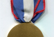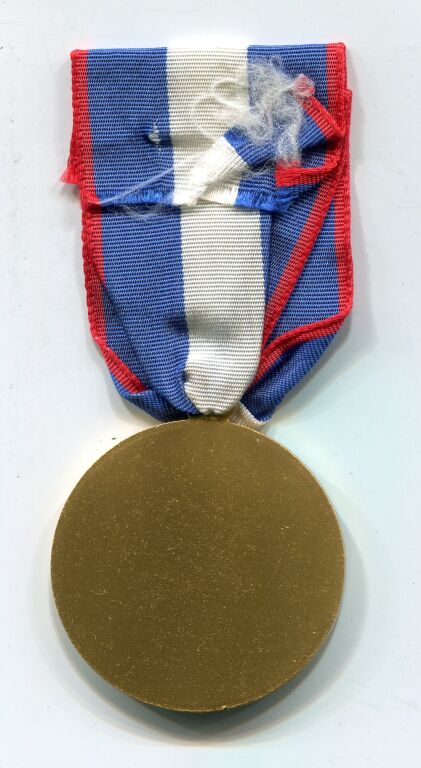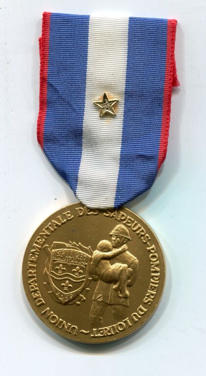 " UNION DEPARTEMENTALE des SAPEURS POMPIERS du LOIRET " - Médaille pendante (décoration) - Module monoface 40 mm métal doré représentant un pompier portant un enfant dans ses bras, à sa gauche blason des pompiers du LOIRET - Ruban 3 bandes bleu-blanc-bleu, liserés rouges en bords, étoile or en centre. - RRB