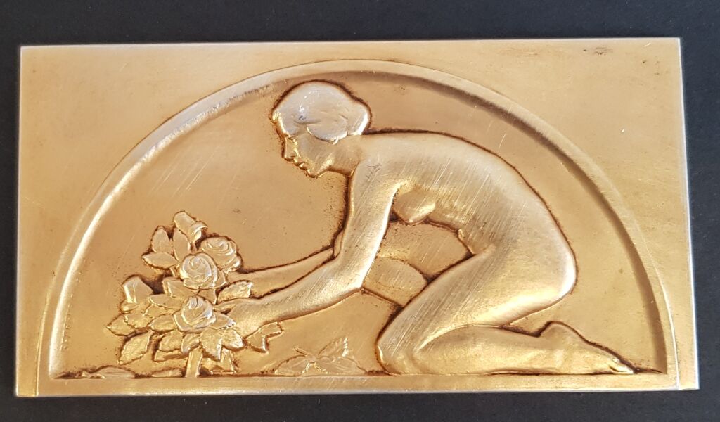 LEGION D' HONNEUR 1956 - plaque 54 x 102 mm - Dans un ovale, une jeune femme nue, de profil, agenouillée, pose une gerbe de roses. ; signature de l'artiste dans l'ovale.