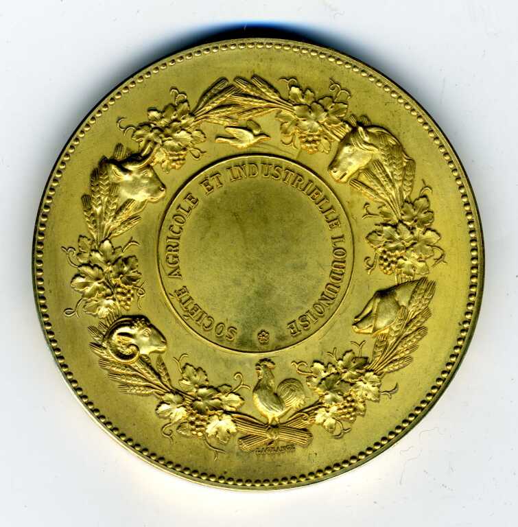 VERMEIL - " SOCIETE AGRICOLE ET INDUSTRIELLE LOUDUNOISE " grande médaille classe OR en argent doré - " REPUBLIQUE FRANCAISE " magnifique haut relief, La République assise de face, tête laurée étoile en dessus, tient main de justice de la main gauche et couronne de laurier de la droite ; à sa gauche coq gaulois debout. Posée sur un socle mention "Liberté-Egalite-Fraternité", œuvre signée A. BOVY.-
