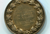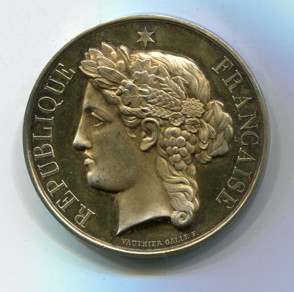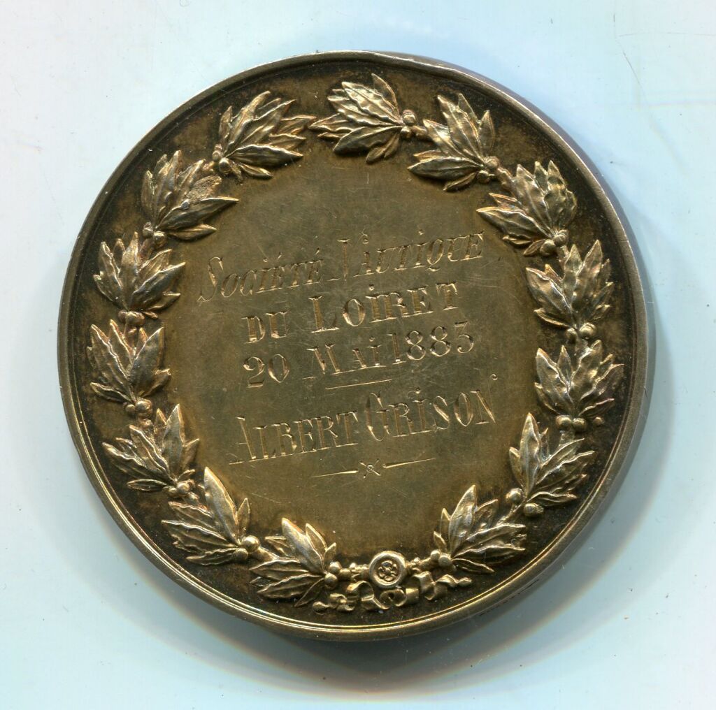 VERMEIL - " SOCIETE NAUTIQUE du LOIRET " grande médaille classe OR en argent doré, 45 mm - " République Française " Tête de Cérès laurée de laurier, épis de blé et grappe de raisin, haut relief profil à gauche, signé Vauthier Galle sous le cou. - Revers : attribution dans une couronne de bouquets de feuilles de laurier " Société Nautique du Loiret, 20 mai 1883, Albert GRISON " - sur la tranche poinçons argent et corne (choc sur la tranche).