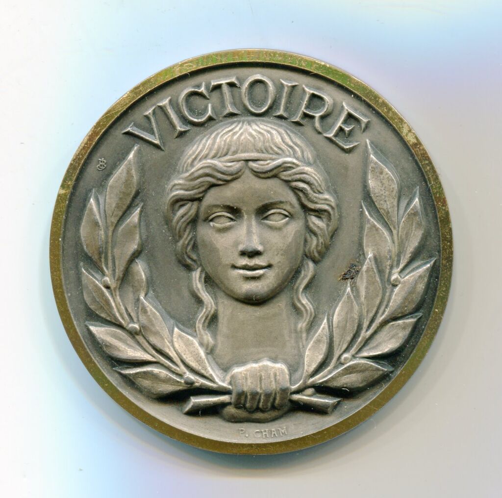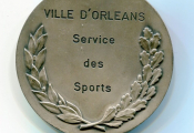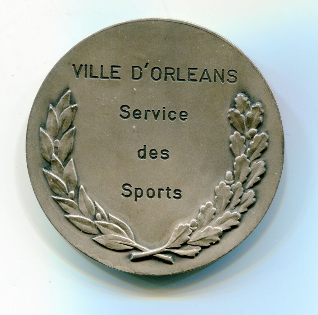 " VICTOIRE " SERVICE des SPORTS VILLE D'ORLEANS ", Médaille classe argent en métal argenté, bordure dorée, fabrication Balme à Saumur. - 50 mm - Tête de Victoire entre 2 palmes, composition signée P. CHAM - revers pour attribution entre 2 palmes de feuilles d'olivier et de chêne - L/A/ n° 1402 - TTB