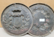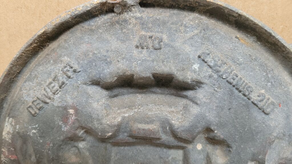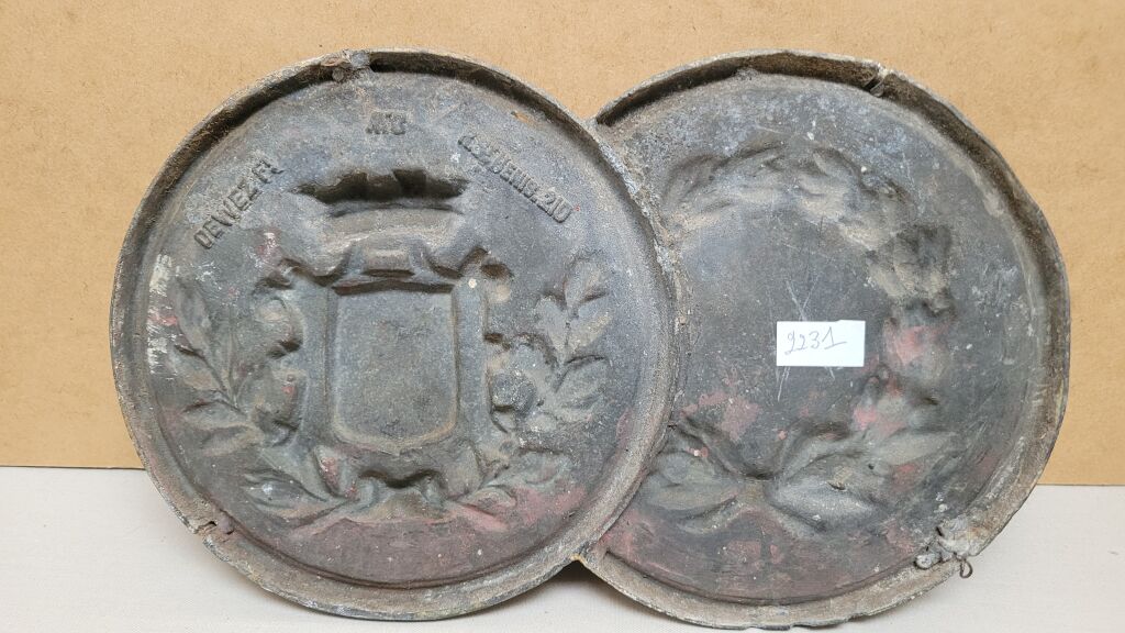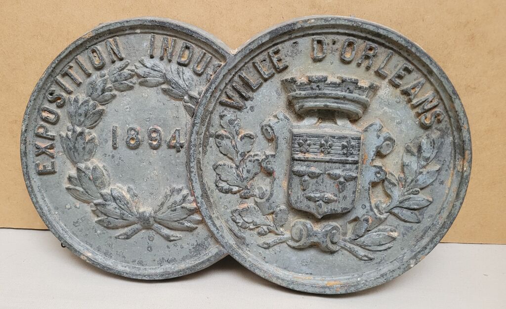 VILLE D'ORLEANS / EXPOSITION INDUSTRIELLE 1894 - PLAQUE géante pour FIXATION MURALE 33 x 20 cm - poids 1,486 kilo. - Forte les 2 faces de la médaille : blason d'orléans surmonté d'une couronne et entouré de palmes de chêne et laurier - Revers texte et date en 2 palmes - Fonte de fer, au dos marque du fondeur : DEWEZ FT. MC RUE St DENIS 210 - L/A n° 1229