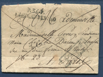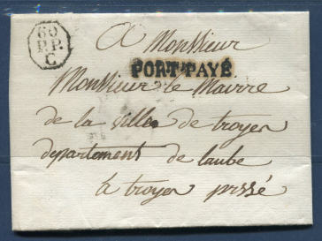 LOUIS XVIII 2e RESTAURATION - Lettre en PORT PAYE de Paris pour Troyes 5 octobre 1822 - Porte griffe de paiement " 60 P.P. " du bureau " C ", frappe en noir dans un cadre à pans coupés (Rochette & Pothion n° 2735) - Porte de plus griffe linéaire "