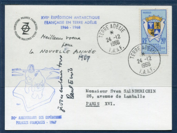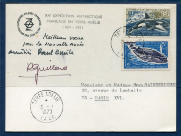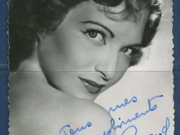 carte au sceau de la Comédie "Meilleurs Vœux" avec envoi autographe signé, au stylo bille : " mes… ma bonne amie M. Escandre ".
