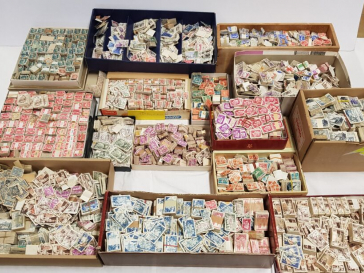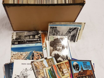 carton - ACCUMULATION environ 1 500 ( mille cinq cents ) CARTES POSTALES anciennes, semi-modernes, modernes. Surtout modernes, cartes touristiques mais aussi cartes des années 1980 /90. commémoratives d'illustrateurs et cartes de salons régionaux, do