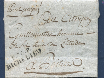 FRANCE - MARCOPHILIE du 18e / 19e SIECLE - " RICHELIEU " (37) - Pli du 21 Nivôse l'an 8 (11 janvier 1800) en PORT PAYE pour Poitiers - marque linéaire sur 2 lignes " P.36.P. / RICHELIEU ", frappe en noir, 9 x 35 mm - Rare marque en service de 1792 à
