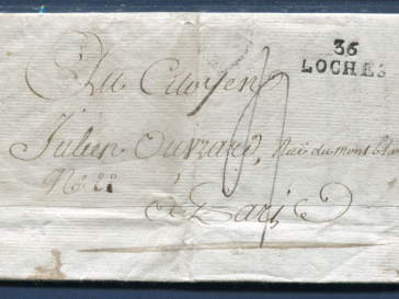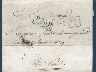 Beau pli en PORT PAYE pour Paris - Marque postale linéaire 2 lignes, 9 x 23 mm, frappe en noir, " P.36.P. / LOCHES " + présence de la griffe encadrée " Ps Ps " ( " port payé pour Paris "
