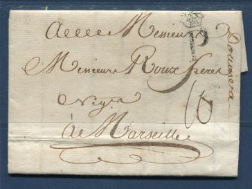 FRANCE - MARCOPHILIE du 18e SIECLE - Pli en PORT DU au départ de Paris du 24 septembre 1771 MARQUE POSTALE de DEPART grand P couronné, frappe en noir, 25 x 12 mm - Lettre d'affaires pour Messieurs Roux frères, négociants à Marseille.