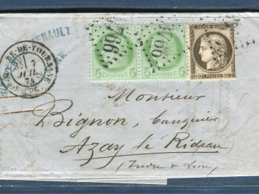 FRANCE - PHILATELIE du 19e SIECLE - " SAINTE MAURE de TOURAINE " (37) - lettre pour Azay le Rideau, bel affranchissement à 40 centimes, 3 timbres : PAIRE ( Cérès grands chiffres n° 53 + 30c brun Cérès n° 56 - oblitération gros chiffres 3766, cachet