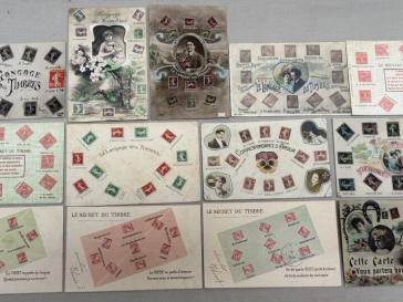 LANGAGE des TIMBRES ou LE SECRET des TIMBRES ou CORRESPONDANCE D'AMOUR - 13 (treize) cartes postales pour tout savoir sur la signification d'amour en fonction de la couleur du timbre employé ou de son orientation de collage….