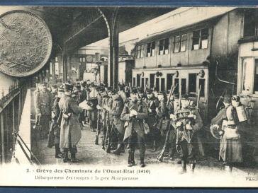 PARIS GREVES des CHEMINOTS de L'OUEST - ETAT 1910 ( * ) - Carte postale, gros plan très animé des soldats d'infanterie, paquetage complet devant un wagon à étage "débarquement des troupes à la gare Montparnasse ". - F.F. 2