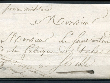 RARE pli en FRANCHISE MILITAIRE avec mention manuscrite en haut à gauche, correspondance autographe signée, au départ de SEVILLE le 3 juin 1810, du Capitaine d' Artillerie à Cheval (*) à Mo