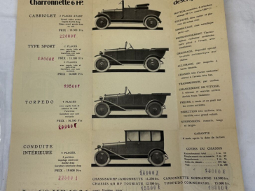 PUTTEAUX (92) - AUTOMOBILES CHARRON ( * ) - rare document publicitaire et tarif des modèles de la CHARRONNETTE 6 HP, automobiles du constructeur, avec tarifs et descriptifs techniques, photographies des modèles. Six volets recto & verso pour :