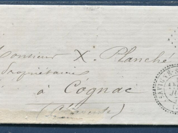 Lettre au départ savigné pour COGNAC - Cachet à date perlé au type 24 du 12 juillet 1873. Timbre 25c Cérès n° 60 rare oblitération gros chiffres 4959. Pothion indice 14.