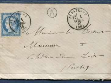 RARE LETTRE pour Château du Loir oblitération au type 16 du 1er avril 1876.