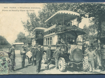 PARIS - carte postale 1906 NOUVEAUX AUTOBUS à IMPERIALE. Très gros plan très animé de 2 engins " de la Compagnie des Omnibus " des "automobiles Eugène Brillié, à roues pleines, à la Porte de Neuilly - Marmusse 655.