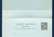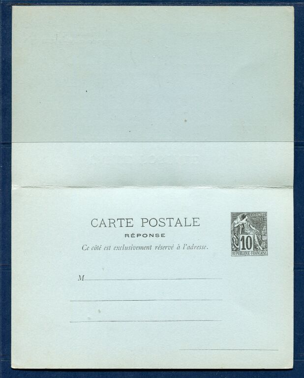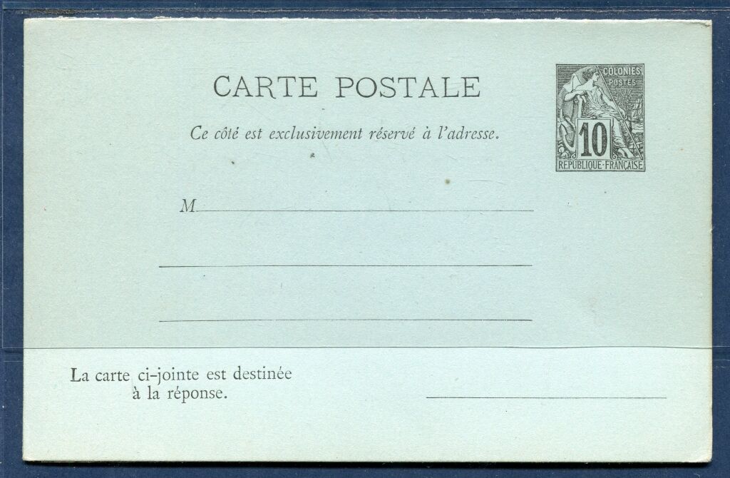 1885 - COLONIES GENERALES FRANCAISES - carte postale ENTIER POSTAL avec REPONSE PAYEE - 10 + 10c au type Alphèe DUBOIS, déesse assise, noir sur carton bleuté. - Neuve, Acep n° CP 7 b.