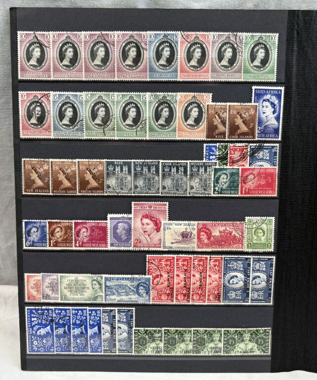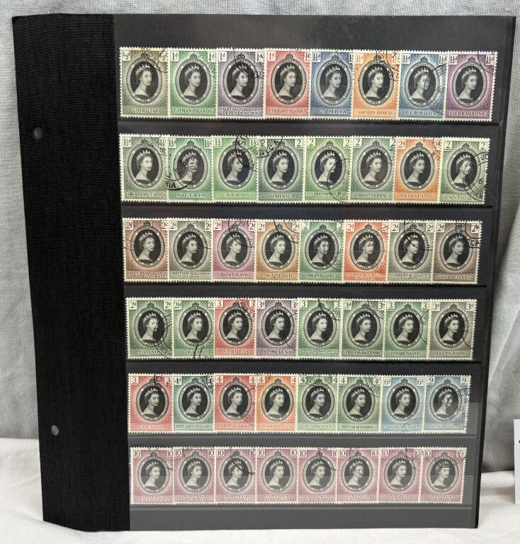1953, COURONNEMENT de la REINE ELIZABETH II - GRANDE SERIE de L' EMPIRE BRITANNIQUE : collection complète des 106 (cent six) timbres différents, oblitérés, émis par la Grande Bretagne et les colonies de l'empire d' Aden à Iles Vierges, pour célébrer cet évènement planétaire.