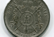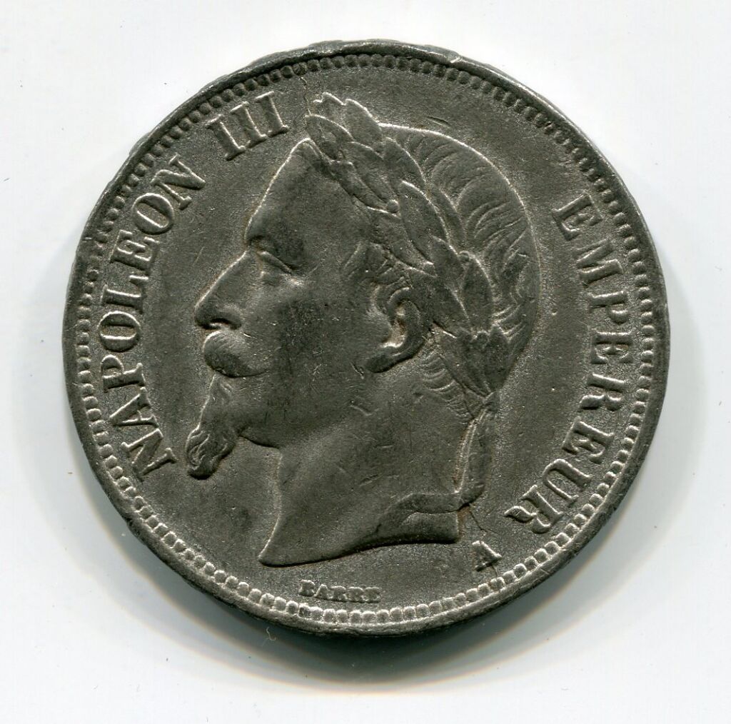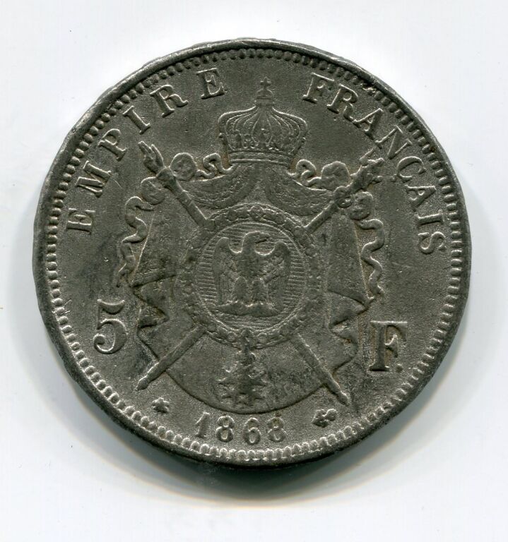 19e siècle - FAUSSE MONNAIE pour TROMPER L' ETAT - " la tune " Monnaie de 5 francs, à la taille d'Ecu, NAPOLEON III tête laurée 1868 A - Fausse en plomb (au lieu d'argent) très finement frappée avers & revers, y compris la tranche Dieu Protège la France " en relief.