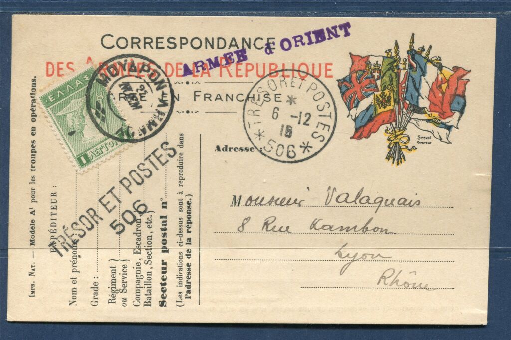 1ère Guerre Mondiale - ARMEE D' ORIENT - Poste militaire français de la base de MOUDROS (GRECE) - carte postale de Franchise Militaire des " Armées de la République ", type aux drapeaux, envoyée par un soldat, en poste à Moudros, pour Lyon - Joli document portant griffe linéaire, frappe en violet, " ARMEE D'ORIENT " + griffe postale TRESOR et POSTES 506 + cachet à date " Trésor et Postes 6 décembre 1915 * 506 ( rare cachet). - nota : pour faire figurer le cachet postal grec Moudros, l'expéditeur, à rajouté un timbre de 1 lepta (n° 179) tête de Mercure.