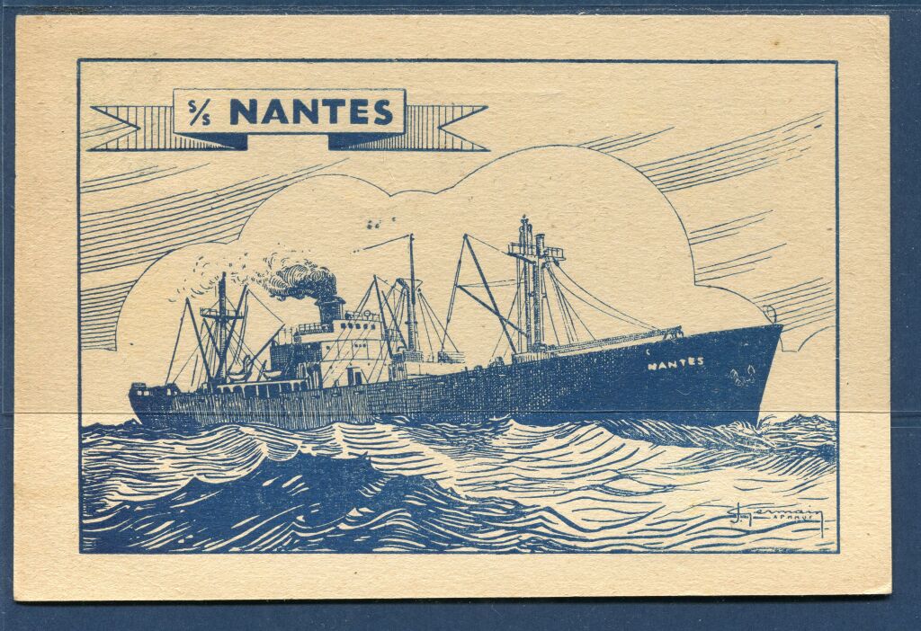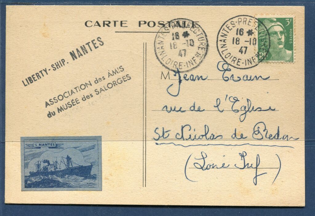 2e guerre mondiale, Bateau LIBERTY SHIP NANTES ( * ) - carte postale commémorative " vue du navire à la mer, par l'illustrateur J. Germain - Voyagée, cachet départ Nantes Préfecture 18 octobre 1947 avec, coté affranchissement, 3 F Gandon vert n° 716 A, la VIGNETTE SPECIALE A L' IMAGE du NAVIRE.