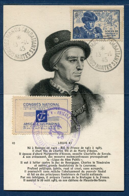 2e Guerre Mondiale, FRANCE COMBATTANTE - NANTES 13 octobre 1945, CONGRES des MARINS COMBATTANTS - Carte postale maximum timbre Louis XI journée du timbre 1945 (n° 743) sur carte concordante. Oblitération commémorative du congrès + VIGNETTE du CONGRES annulée par le cachet à l'ancre des Marins Coloniaux philatélistes.