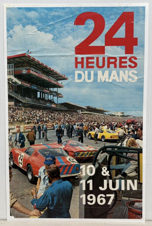 AFFICHE 24 HEURES DU MANS 10 & 11 JUIN 1967 - vue des autos au départ (ancien modèle de départ en épi) devant les tribunes - Photo André Delourmer - Imprimerie Oberthur - 58 x 37 cm - contrecollé sur carton d'encadrement.