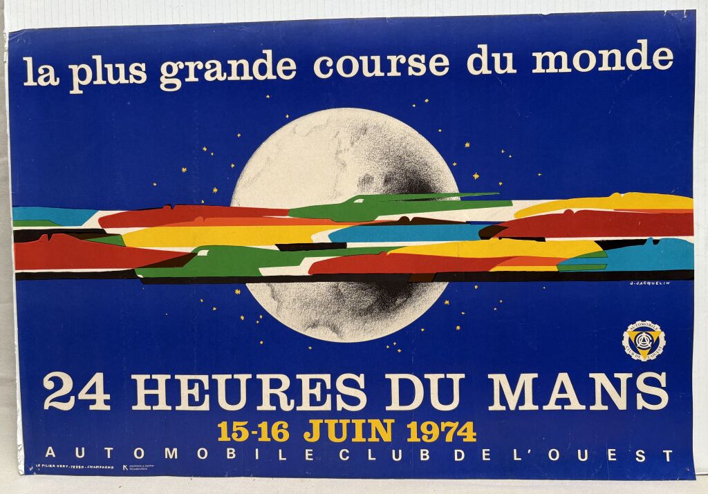 AFFICHE 24 HEURES DU MANS 15 & 16 JUIN 1974 - " groupe d'autos devant les tribunes - Illustration affichiste J. JACQUELIN - Voitures en course sur fond de ciel étoilé et pleine lune - édition " Le Pilier Vert " Le Mans - impression offset polychromie.