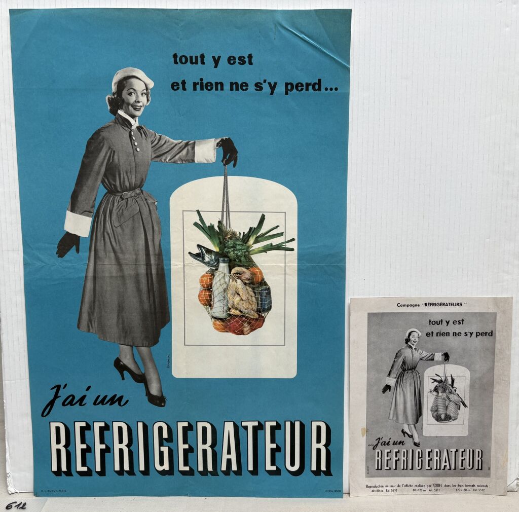 JOINT A L' AFFICHE : prospectus publicitaire 25,5 x 20 cm intitulé " CAMPAGNE REFRIGERATEURS ", information des 3 formats d'affiches proposés par Sodel pour la campagne (note a ses dépositaires électriciens).