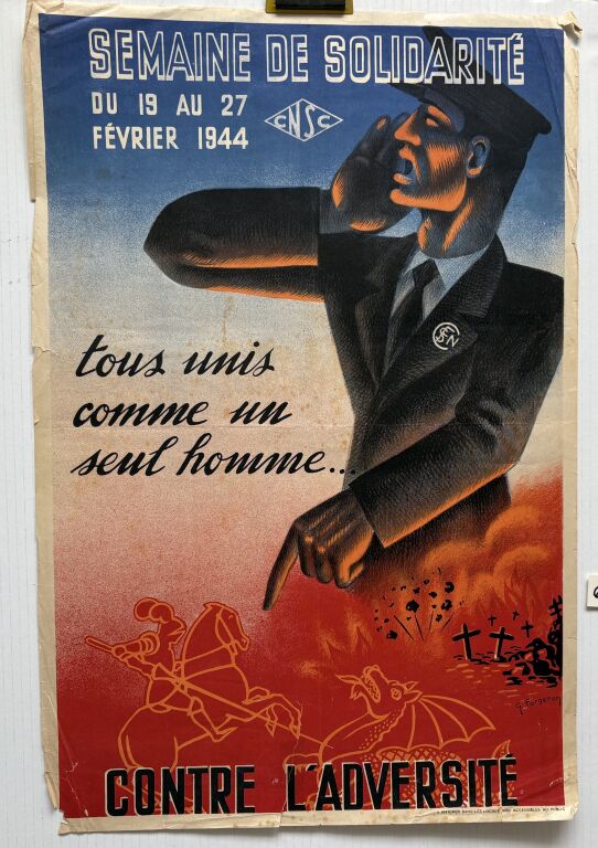 AFFICHE du REGIME de VICHY : ETAT FRANCAIS - " SEMAINE de SOLIDARITE, du 19 au 27 février 1944 " … tous unis comme un seul homme…CONTRE L'ADVERSITE.
