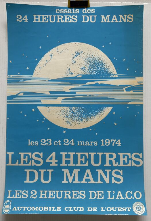 " LES 4 HEURES du MANS " - " LES 2 HEURES de L'A.C.O. " - " Illustration de l'affichiste J. JACQUELIN, voitures en course sur fond de lune ( signé milieu droit) - sérigraphie monochrome bleu ciel Euroseri. - édition " Le Pilier Vert " Le Mans - 58,5 x 39 cm.